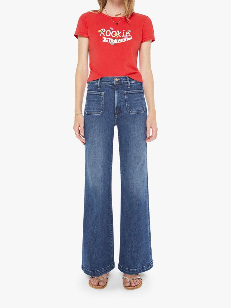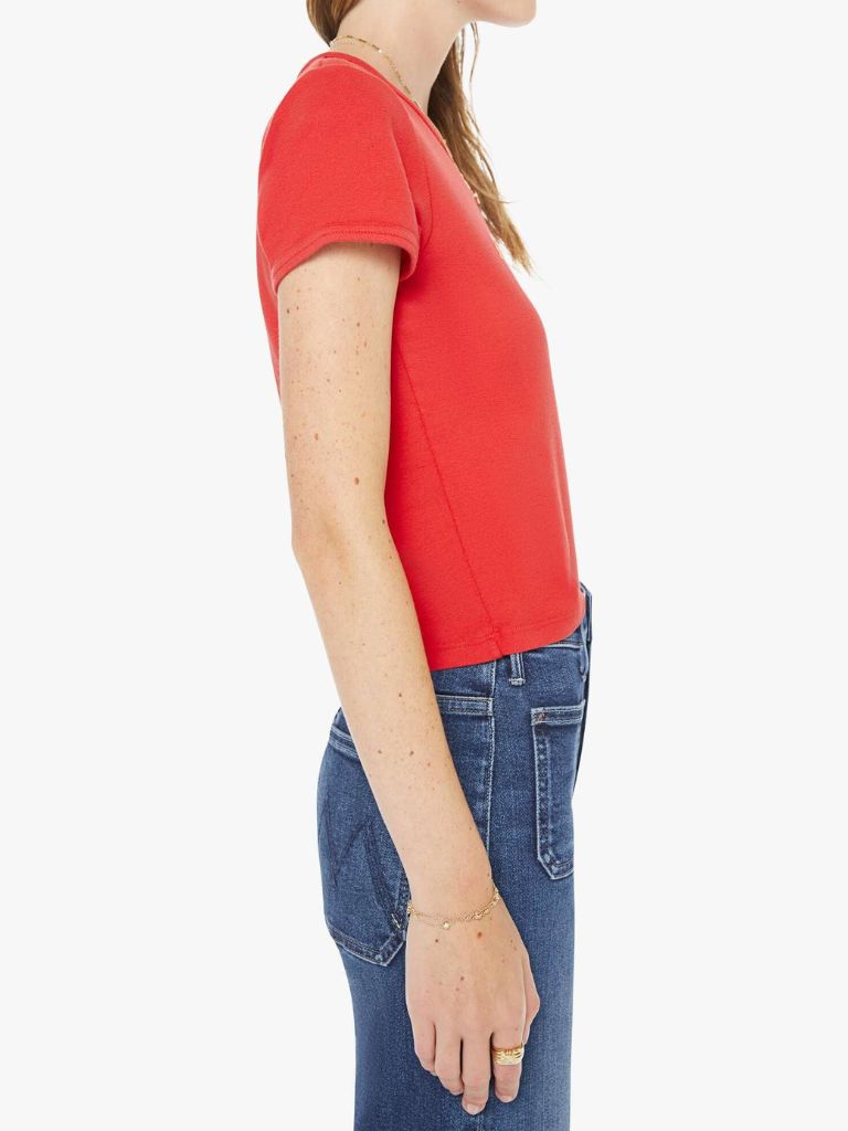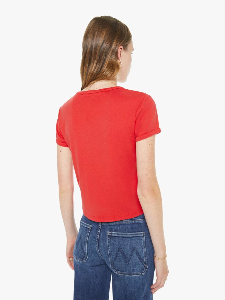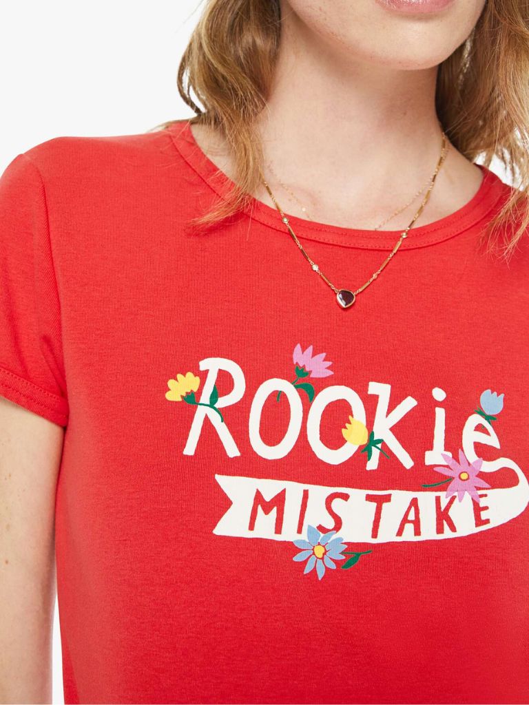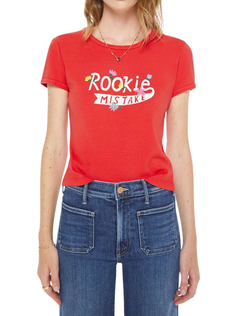 First time for everything. A shrunken crewneck tee with extra-short sleeves and a cropped hem. Made from 100% cotton in red, The Itty Bitty Ringer in Rookie Mistake features a white text graphic with flowers on the front.