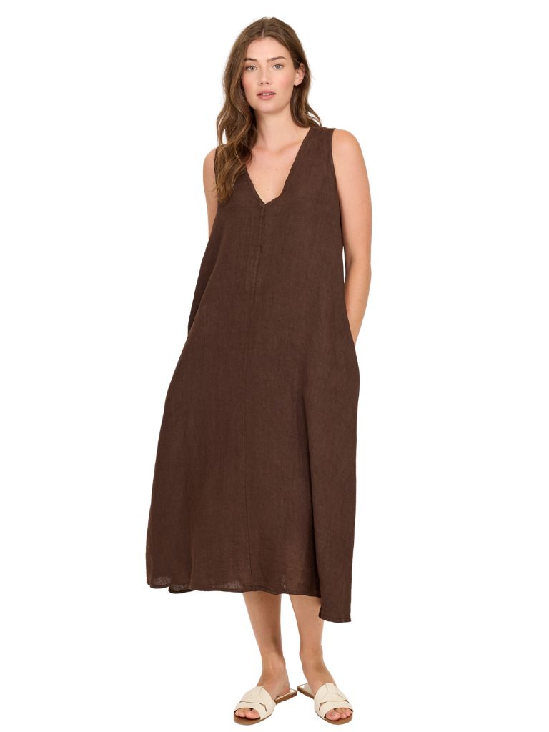 Effortlessly chic and endlessly wearable, our easy breezy linen midi dress in the season's trending coffee hue is the definition of understated luxury. Crafted from breathable, lightweight linen that drapes beautifully, this dress can be worn from morning errands to sunset dinners.