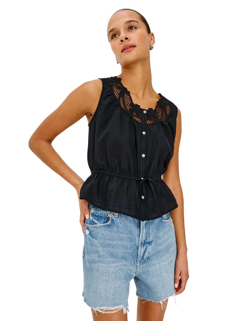 The Leilani Top is crafted from lightweight, breezy beach cotton with a scoop neckline, lattice embroidery, front buttons, and a relaxed silhouette cinched at the waist with adjustable ties.