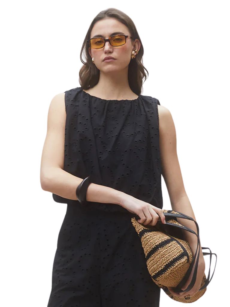 A fresh take on warm-weather dressing, this sleeveless black eyelet blouse blends effortless ease with subtle texture. Designed with a classic crew neckline and a relaxed, baggy silhouette, it drapes beautifully for an airy, laid-back feel. The intricate eyelet detailing adds just the right amount of interest, elevating this everyday staple into something quietly striking. Easy to style and endlessly versatile, it’s the piece you’ll reach for when you want comfort with a polished edge