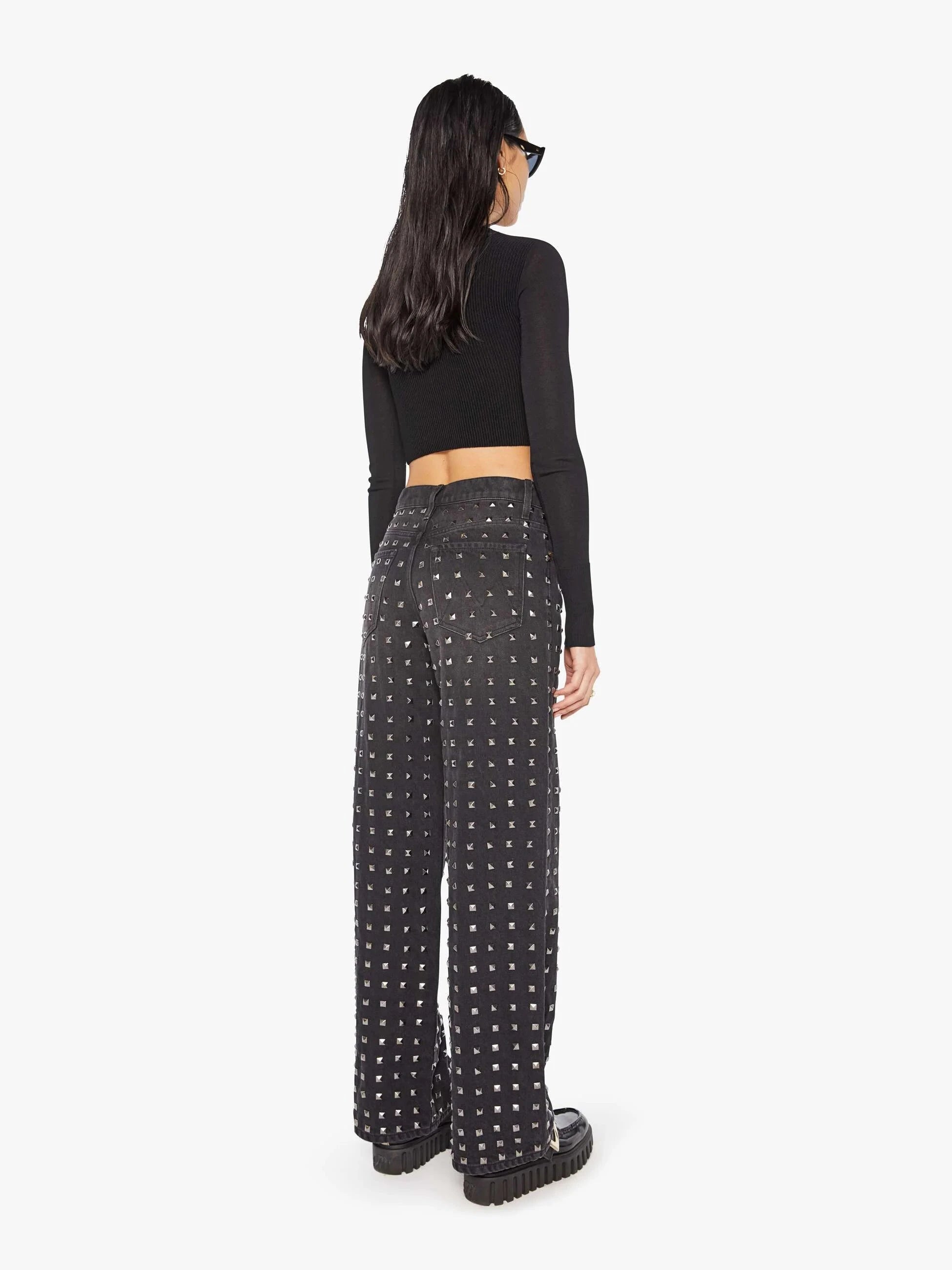 High-waisted jeans from SNACKS!, a collection of unconstrained silhouettes leaning into exaggerated shapes and extreme proportions. Experimental and non-era specific. For everyone, or not. The wide straight-leg jeans are designed with a button-fly and a long 32-inch inseam with a clean hem. They're made from rigid denim in faded black with square studs throughout, a pretzel-detailed button and candy-inspired interior rivets. Would you like a treat?