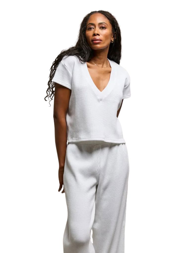 Say hello to the Jada, your new favourite reason to stay on the couch and look like a pro doing it. not just a tee; a weighted waffle-knit with a deep v-neck and boxy fit that has enough shape to keep you looking put together.