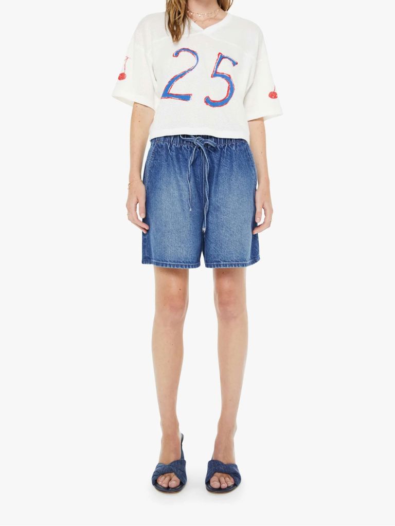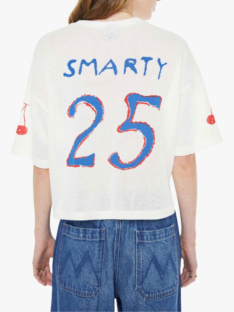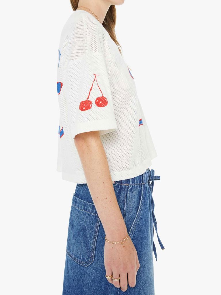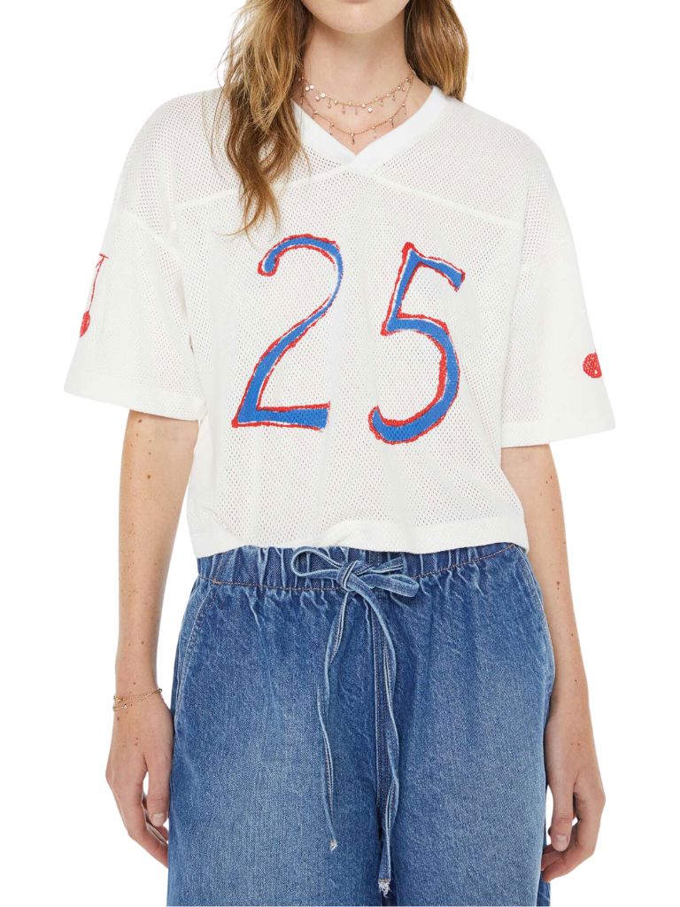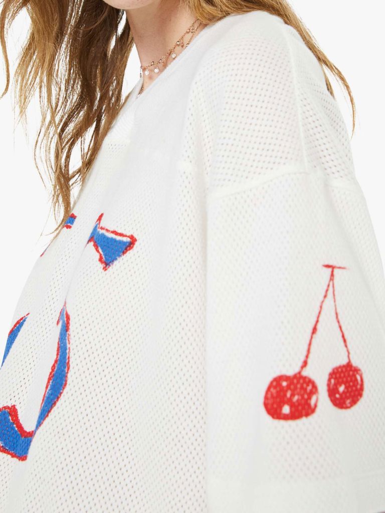 Smart cookie. MOTHER's take on the football jersey is designed with a V-neck, drop shoulders, short, boxy sleeves and a cropped hem. Made from 100% cotton mesh in white, the top features a hand-drawn 25 graphic on the front and back and cherries on the sleeves.
