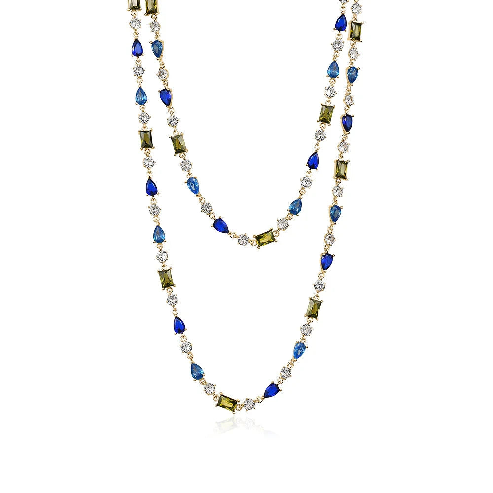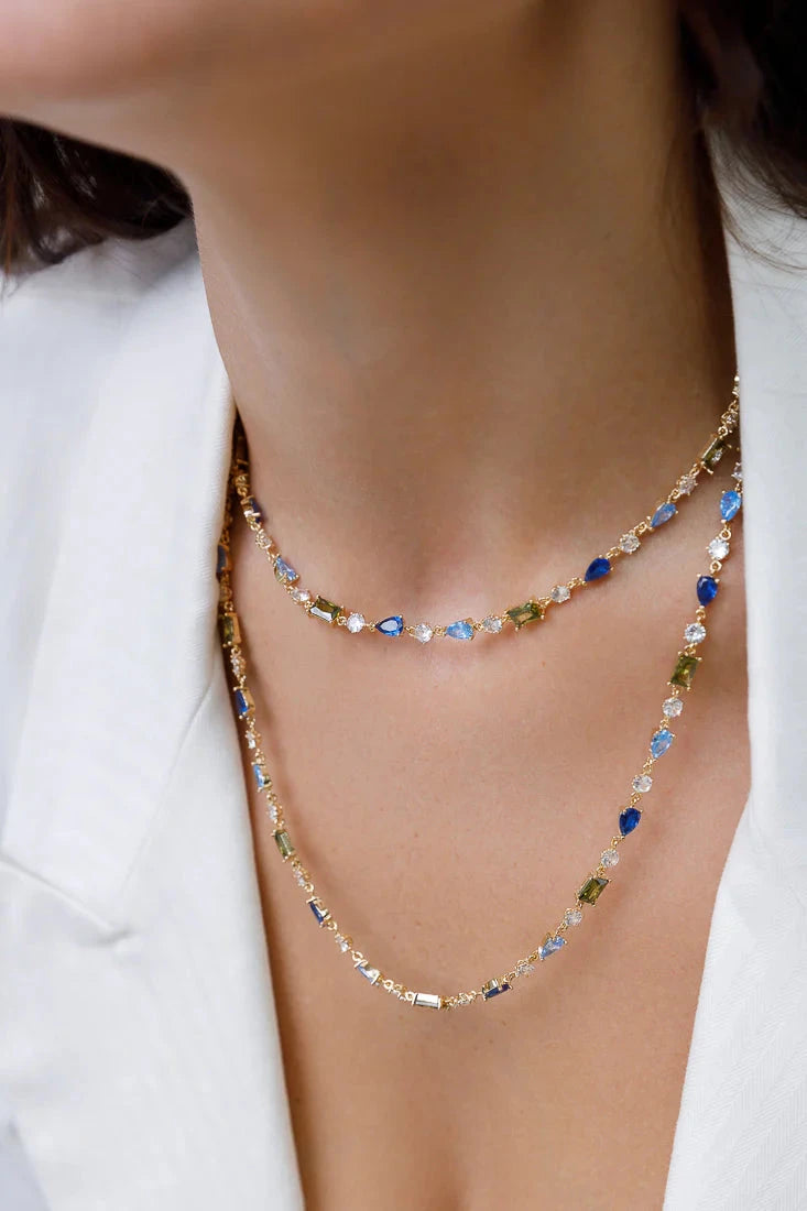 This beautiful necklace has different shaped crystals in a blue pastel hue.