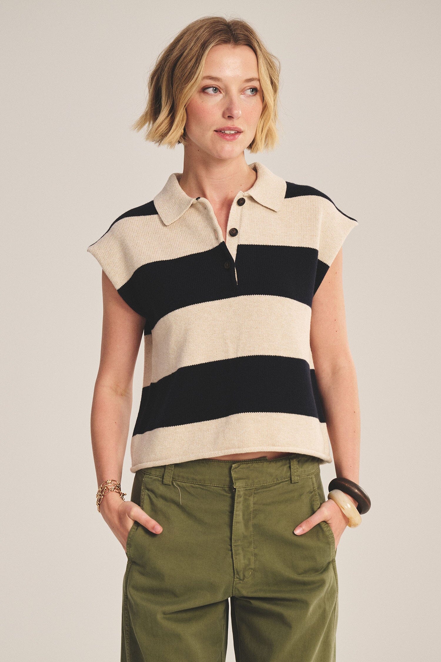 Crafted from a soft cotton-cashmere blend, this sweater polo combines cozy comfort with refined style. Featuring a ribbed collar, 3-button placket, rolled hem, and a slightly cropped fit, it offers a modern, effortless silhouette. Perfect for layering or wearing solo.